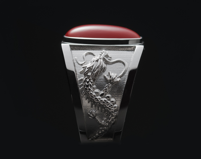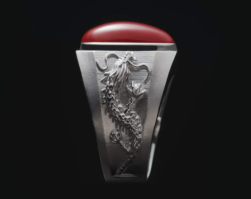 The ring has a glossy finish The dragon and the dragon’s scales have a matte finish to three-dimensionally enhance the heroic and powerful climbing or rising dragon.